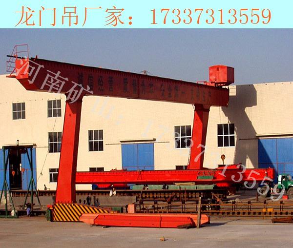 四川資陽龍門吊廠家17337313559按用途形式1.軌道門式起重機。這種起重機多采用箱型式和桁架式結(jié)構(gòu),用途最廣泛??梢园徇\各種成件物品和散狀物料,起重量在100噸以下,跨度為4~39米。用抓斗的普通門式起重機工作級別較高。普通門式起重機主要是指吊鉤、抓斗、電磁、葫蘆門式起重機,同時也包括半門式起重機。2. 水電站龍門起重機。主要用來吊運和啟閉閘門,也可進行安裝作業(yè)。起重量達80~500噸,跨度較小,為8~16米;起升速度較低,為1~5米/分。這種起重機雖然不是經(jīng)常吊運,但一旦使用工作卻十分繁重,因此要適當(dāng)提高工作級別。3. 造船龍門起重機。用于船臺拼裝船體,常備有兩臺起重小車:一臺有兩個主鉤,在橋架上翼緣的軌道上運行;另一臺有一個主鉤和一個副鉤,在橋架下翼緣的軌道上運行,以便翻轉(zhuǎn)和吊裝大型的船體分段。起重量一般為100~1500噸;跨度達185米;起升速度為 2~15米/分,還有0.1~0.5米/分的微動速度。4. 集裝箱龍門起重機。用于集裝箱碼頭。拖掛車將岸壁集裝箱運載橋從船上卸下的集裝箱5. 軌道龍門吊。運到堆場或后方后,由集裝箱龍門起重機堆碼起來或直接裝車運走,可加快集裝箱運載橋或其他起重機的周轉(zhuǎn)??啥逊鸥?~4層、寬6排的集裝箱的堆場,一般用輪胎式,也有用有軌式的。集裝箱龍門起重機與集裝箱跨車相比,它的跨度和門架兩側(cè)的高度都較大。為適應(yīng)港口碼頭的運輸需要,這種起重機的工作級別較高。起升速度為8~10米/分;跨度根據(jù)需要跨越的集裝箱排數(shù)來決定,最大為60米左右相應(yīng)于20英尺、30英尺、40英尺長集裝箱的起重量分別約為20噸、25噸和30噸。