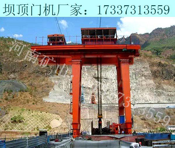 廣東韶關(guān)壩頂門(mén)機(jī)銷(xiāo)售廠家17337313559閘壩式水電站工程中門(mén)機(jī)軌道梁的吊裝方法,該方法操作方便、成本低、施工現(xiàn)場(chǎng)適應(yīng)性強(qiáng),在使用中產(chǎn)生了顯著的社會(huì)效 益和經(jīng)濟(jì)效益。為了達(dá)到以上目的,本發(fā)明提供的閘壩式水電站工程中門(mén)機(jī)軌道梁的吊裝方法, 主要包括五個(gè)部分,即軌道梁基坑平移、固定雙吊點(diǎn)懸臂軌道式桁吊的安裝、軌道梁吊運(yùn)、 固定雙吊點(diǎn)懸臂軌道式桁吊的轉(zhuǎn)移以及下游門(mén)機(jī)軌道梁的閘墩頂平移,其中,所述軌道梁基坑平移,包括以下步驟第一步清理場(chǎng)地,鋪設(shè)軌道;第二步用2臺(tái)50噸千斤頂先將梁一端頂起,把軌道伸入梁下,將旱船放入梁與 軌道之間,最后將梁放在旱船上,取出千斤頂再頂另一端梁;2臺(tái)千斤頂起梁時(shí)必須保持同 步,不宜起得太高、軌道和旱船能放進(jìn)去即可;放入旱船前在軌道上表面均勻涂抹些黃油, 以減小牽引阻力;第三步在旱船和預(yù)先埋設(shè)的地錨上分別掛上10噸單輪滑車(chē);第四步纏繞鋼絲繩,鋼絲繩一端固定在地錨上,另一端繞過(guò)動(dòng)滑輪和導(dǎo)向滑輪后 掛在挖掘機(jī)上;第五步以2臺(tái)挖掘機(jī)為動(dòng)力平移軌道梁至距閘墩根部IOcm左右處,2臺(tái)挖掘機(jī) 牽引時(shí)應(yīng)基本保持速度一致。